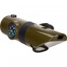 Прибор состоит из трех частей. Центральная часть – это круглая лупа, которую можно использовать для чтения мелкого текста или изучения крошечных объектов. Еще одна часть включает свисток для подачи звуковых сигналов и зеркало. Последний элемент конструкции дает доступ сразу к трем функциям: компасу, термометру и фонарику. Кнопка включения фонарика расположена в верхней части корпуса, для питания используется батарейка типа CR1220.